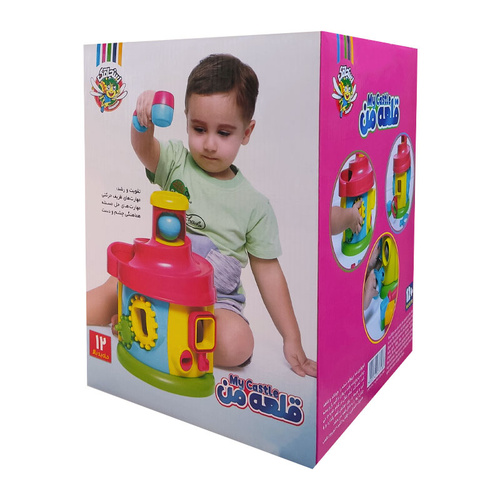 کوچولوی شما می تواند دسته را بچرخاند و شاهد چرخیدن چرخ دنده باشد، در ها را با کلید باز و بسته کند، کشف کند کدام شکل در کدام حفره جا می گیرد و توپ ها را روی دودکش قلعه بگذارد و با چکش آن ها را روی دودکش قلعه بگذارد و با چکش آن ها را به داخل قلعه سر بدهد.