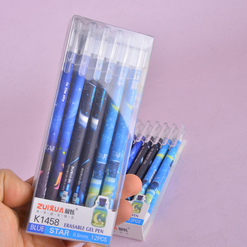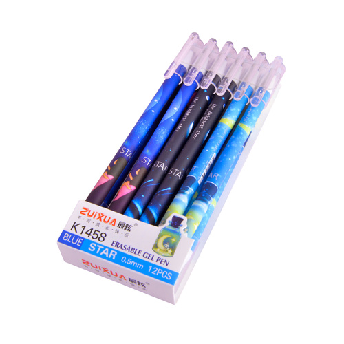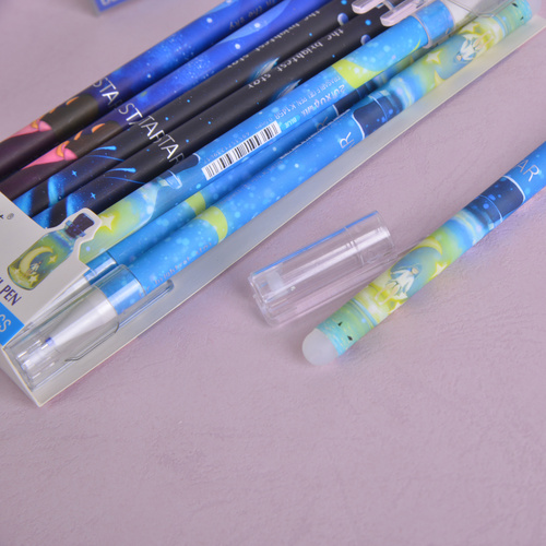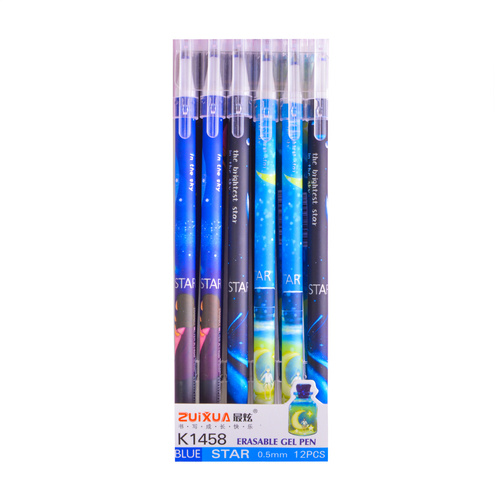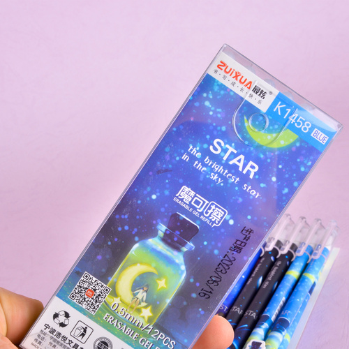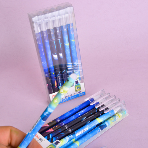 12 عدد روان نویس پاک کن دار 0.5 و با رنگ نوشتاری آبی , بسیار روان و با کیفیت با طرح ستاره و آسمان و دختر ( مطابق تصاویر ) که در یک بسته بندی طلقی بسیار زیبا قرار گرفته است . در انتهای روان نویس پاک کن بینهایت قرار دارد و به راحتی خطوط و نوشته ای روان نویس را پاک میکند