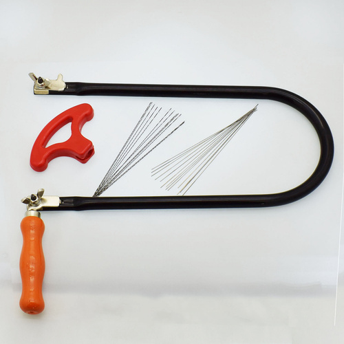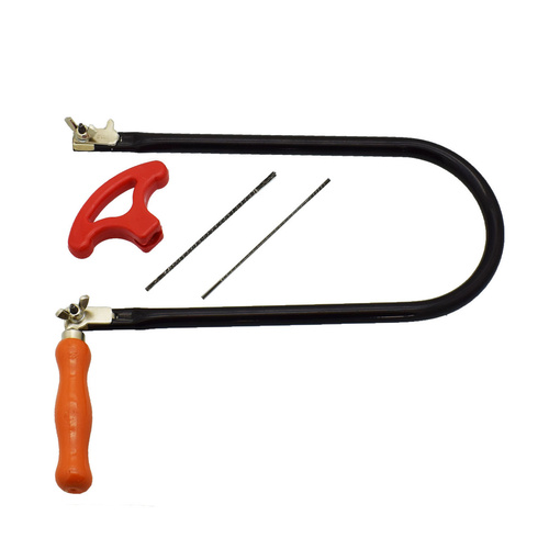 این مجموعه شامل یک کمان اره مویی فلزی ساخت آلمان به همراه دسته چوبی، دو بسته 12 عددی تیغه تخت و گرد و یک آچار مخصوص سفت کردن تیغه است. استفاده از آچار مخصوص باعث راحتی باز و بسته کردن تیغه با نیروی بسیار کمتر و همچنین سفت شدن کامل تیغه و جلوگیری از شکستن تیغه به دلیل خارج شدن از کمان در زمان برش میشود.از این ابزار در معرق کاری و ساخت زیورآلات رزینی استفاده می شود زیرا کمان اره مویی به شکلی طراحی شده که در مسیرهای قوس دار و پیچیده به راحتی حرکت می کند و تغییر جهت می دهد.سبکی و خوش دست بودن این کمان اره با دسته چوبی باعث شده تا جزو بهترین های اره مویی در بازار محسوب شده و مورد استفاده افراد حرفه ای قرار بگیرد.پیچ ها نیز با مقاومت بالا بوده و به مرور زمان هرز نمی شوند.