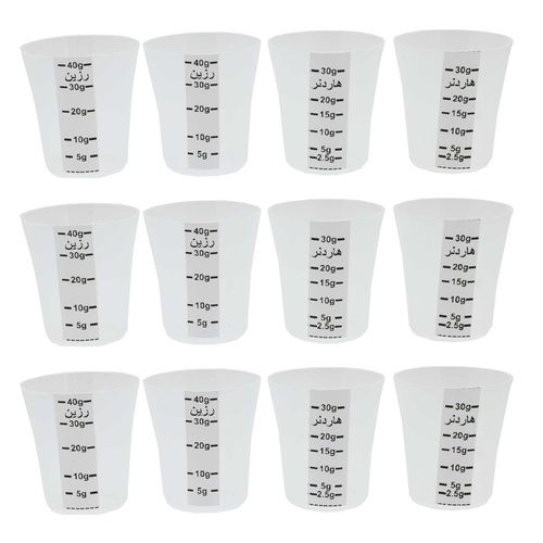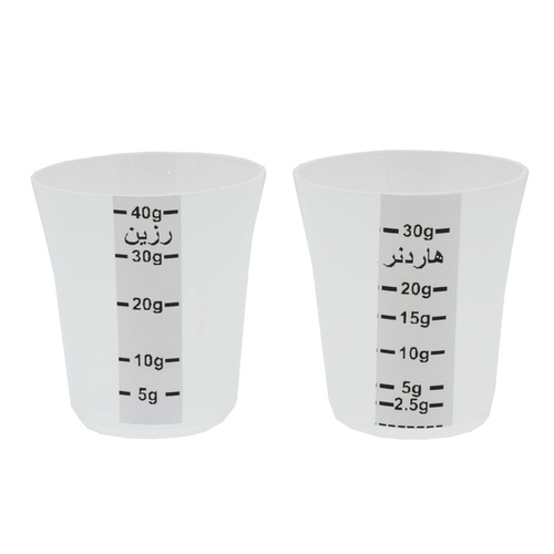 پیمانه های اندازه گیری فوق بر حسب چگالی رزین و هاردنر به صورت متفاوت مدرج شده اند و نسبت وزنی دو جز تا حد زیادی رعایت خواهد شد. به دلیل چگالی متفاوت رزین و هاردن اپوکسی بهترین وسیله برای اندازه گیری هر جز ترازو است. در صورت استفاده از پیمانه های معمولی نسبت وزنی رزین و هاردنر رعایت نخواهد شد. دقت کنید که هر جز دقیقا با پیمانه مخصوص خود اندازه گیری شود.